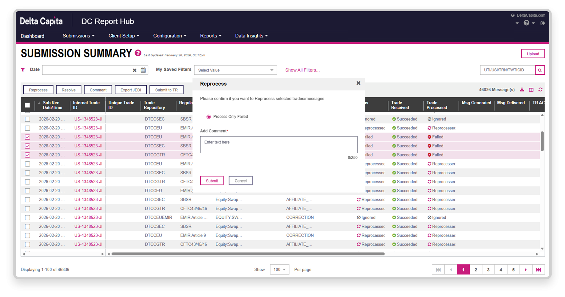 Ensure high‑quality submissions with seamless UTI generation and industry‑leading data accuracy supported by expert‑led exception management. Straight‑through processing delivers timely reporting in seconds, with connectivity across major TRs, SDRs, and ARMs.
